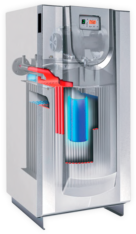 Рівень шуму в 18 разів нижче, ніж у жаротрубного котла з модулюючим пальником. Немає необхідності в шумоізоляції котельні, а також установці дорогих шумоглушників пальників та димоходів.